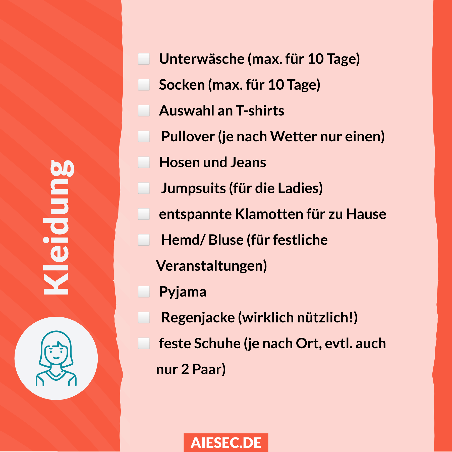 Passe sie einfach nach deinen Wünschen & deinem Land an. Schreibe dir auf, was dir fehlt, und packe vor deinem Aufenthalt im Ausland wirklich Schritt für Schritt mit dieser Liste. So wirst du nichts vergessen und nimmst auch nicht zu viel unnötigen Kram mit. Wie gesagt, weniger ist mehr!
